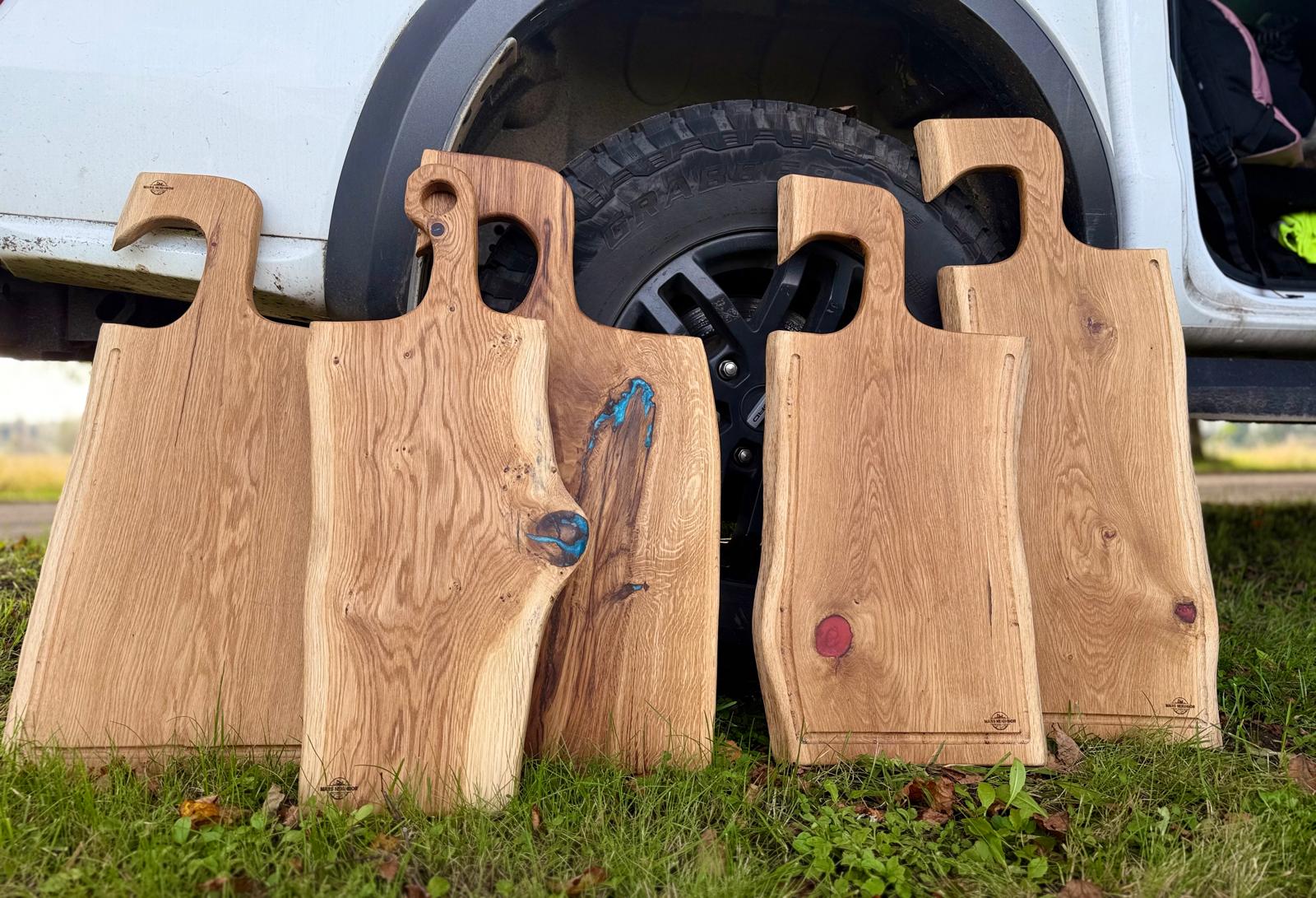 A striking handcrafted oak serving board designed for those who appreciate bold style and practicality. Its unique axe-shaped handle not only makes serving comfortable but also gives the board a powerful, rustic character. Small natural knots in the oak wood are artfully filled with red epoxy, creating subtle yet eye-catching details.